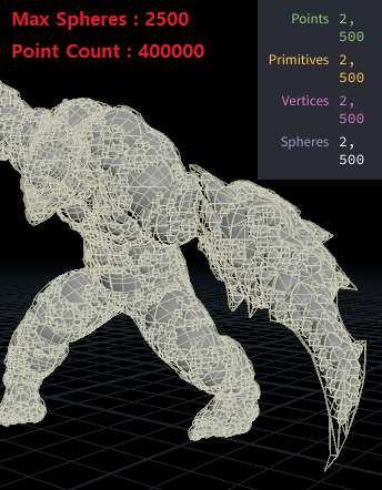 즉, Point Count가 높다면 보다 고르게 캐릭터의 안쪽을 Sphere로 채우는 결과를 얻을 수 있을 것이고, 너무 낮다면 기대한 것보다 고르지 않게 Sphere들이 배치가 될 수도 있다.