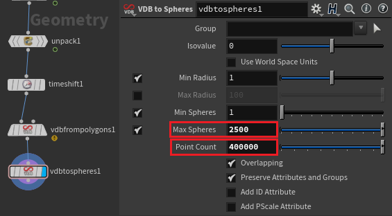 VDB to Spheres의 파라미터에서 가장 중요한 부분은 Max Spheres와 Point Count의 밸런스가 될 것이다.
